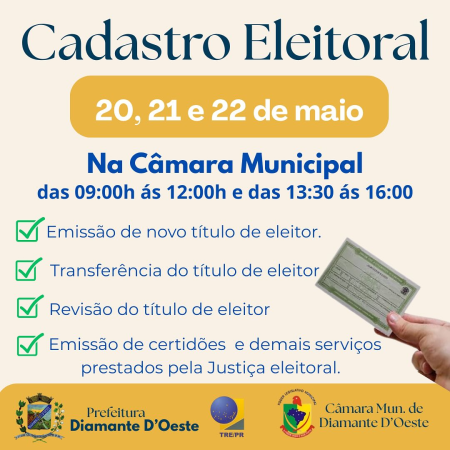 Notícias Atenção, Eleitor!Por cr2-admin1714 de maio de 2025 Nos dias 20, 21 e 22 de maio, a Justiça Eleitoral estará realizando o Cadastro Eleitoral na Câmara Municipal, das…