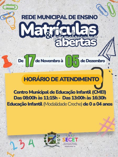 Sec de Educação 🚨🚨 ATENÇÃO PAIS/RESPONSÁVEISPor Anderson de Oliveira Guassu24 de novembro de 2025 ATENÇÃO PAIS/RESPONSÁVEIS A Secretaria Municipal de Educação comunica que o período de matrícula e rematrículas para a Rede Municipal de Ensino…