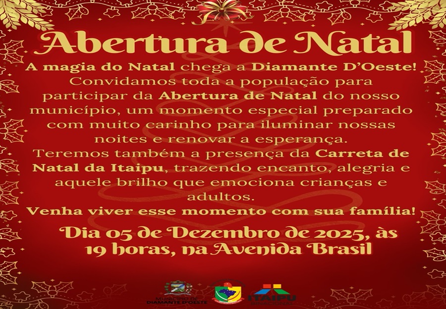 Convidamos toda a população para celebrar conosco a Abertura de Natal, um momento especial preparado com muito carinho para iluminar nossa cidade e encher nossos corações de esperança.